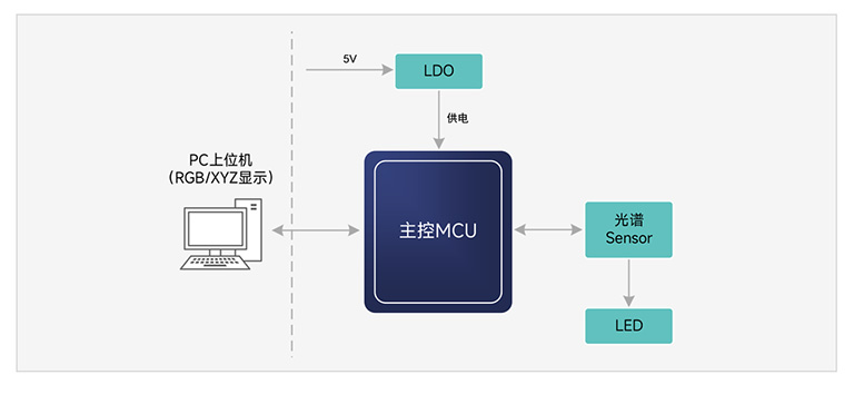 方案基于光谱传感器,通过驱动LED白等光源照射被测物体并反射光谱信息,将被测物体的光谱信息转换为RGB或XYZ数据上传至上位机显示,从而可以量化被测物体的颜色信息。