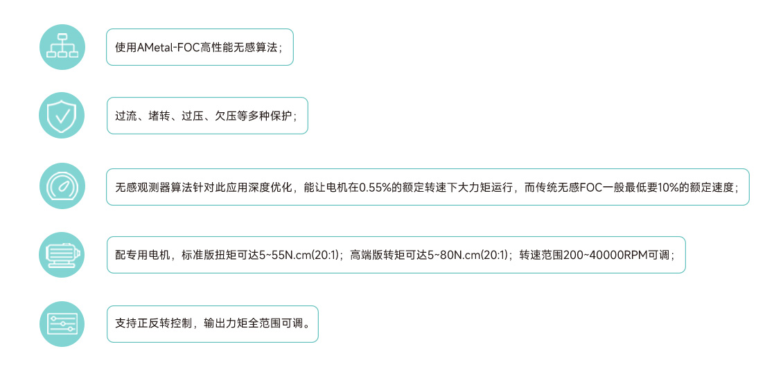 牙科种植机是用于口腔治疗的医疗设备,本牙科种植机电调方案实现了对马达转速的连续可调,机头大扭矩,实现恒转速恒扭矩,可最大限度减少牙根周围牙槽细胞损伤,达到最好的治疗效果。方案使用AMetal-FOC高性能无感算法,具有常规FOC控制噪音小,能效高及扭力大的特点,转速控制精度高,启动良好。